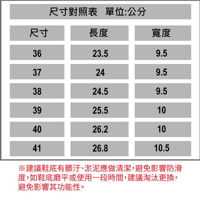 除參考平時著波鞋碼外,也請量度腳長/寬度 ? cm 比對鞋碼表